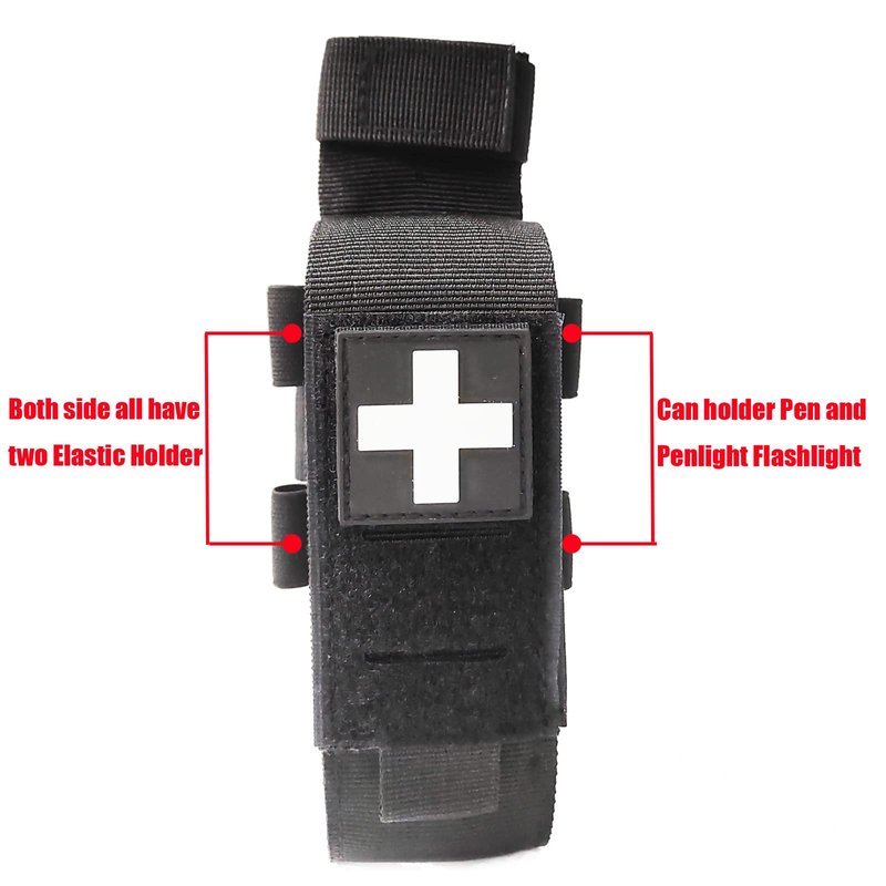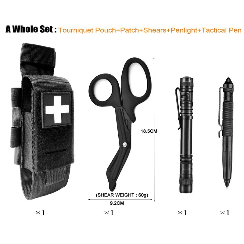 - ✚ONE ITEM INCLUDE : One Tourniquet Pouch + Cross Patch + Tactical Pen +Trauma Shear+Penlight(Not included Tourniquet).Well made, perfect size!Perfect tourniquet holder.TQ HOLDER SIZE:6×2×1.57INCH.