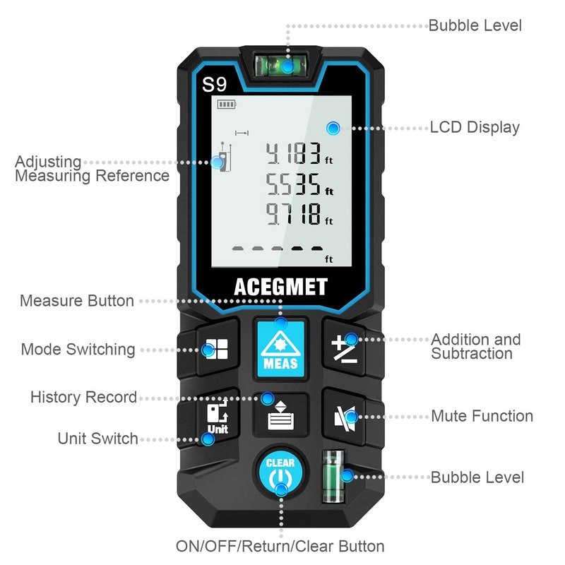 Laser Measure, ACEGMET Laser Measurement Tool (229Ft Ft/in/M) Backlit LCD with Mute Function Laser Distance Measure, Pythagorean Mode, Measure Distance, Area and Volume Laser Tape Measure
