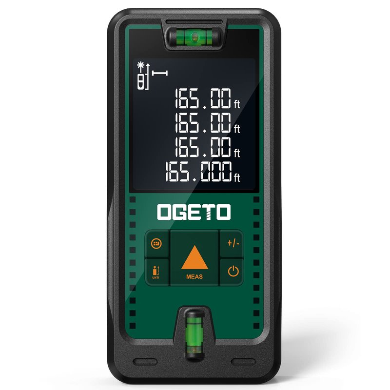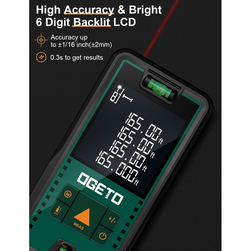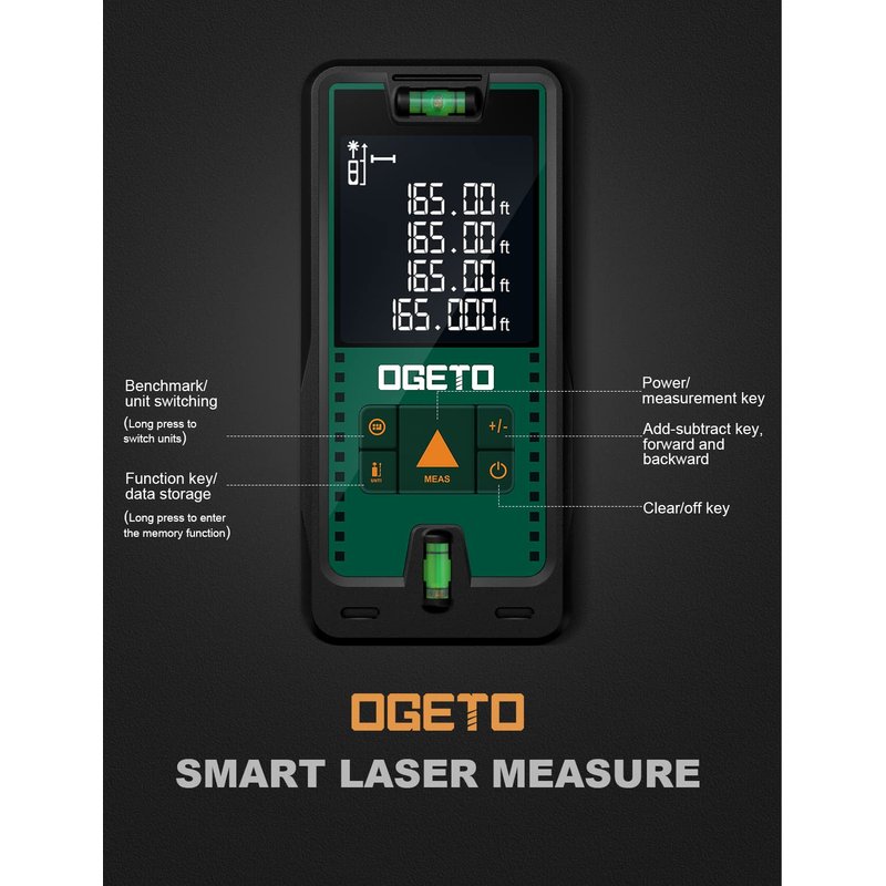 Laser Measure, Ogeto 165 Feet Digital Laser Distance Meter with 2 Bubble Levels,M/in/Ft Unit Switching Backlit LCD and Pythagorean Mode, Measure Distance, Area and Volume
