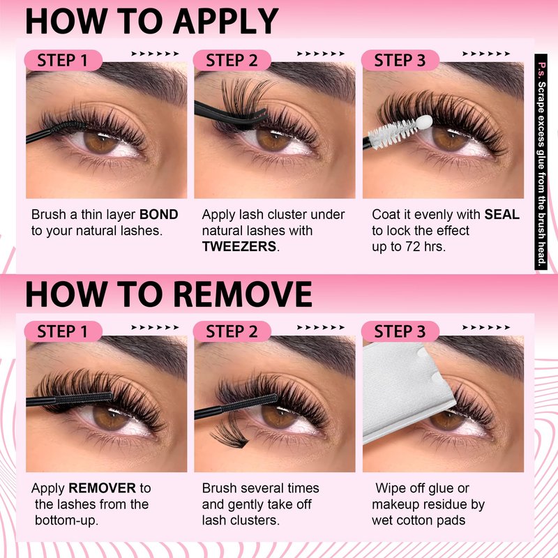 - 【Easy to Apply Like Using Mascara】The glue bond and seal with spiral brush head, which is adjustable and flexible. Brush a thin layer to your natural lashes with the BOND side, stick lash clusters under your natural lashes, coat it evenly with the SEAL to lock the effect.