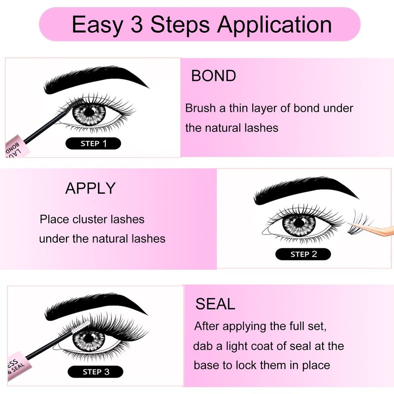 - Easy 3 Steps Application:1. Scrape off any excess lash bond and brush a thin layer of bond under the natural lashes 2. Place cluster lashes under the natural lashes 3. After applying the full set, dab a light coat of seal at the base to lock them in place.