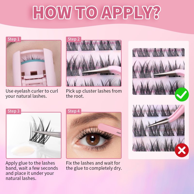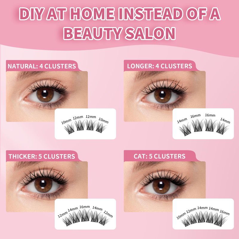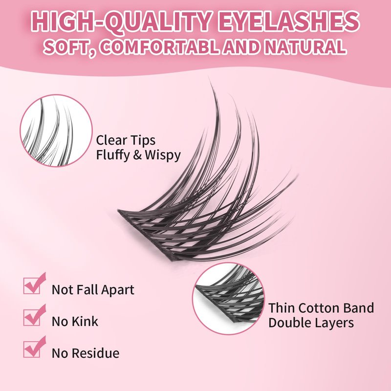 - 【Reusable High-quality Eyelashes】Cluster lashes are made of high-quality PBT synthetic fiber, soft, lightweight and durable. It is safe to wear and does not irritate the eyes, providing you with long-lasting and natural lash clusters. With the right care, they can be used multiple times, making it easy to maintain your perfect look all day.