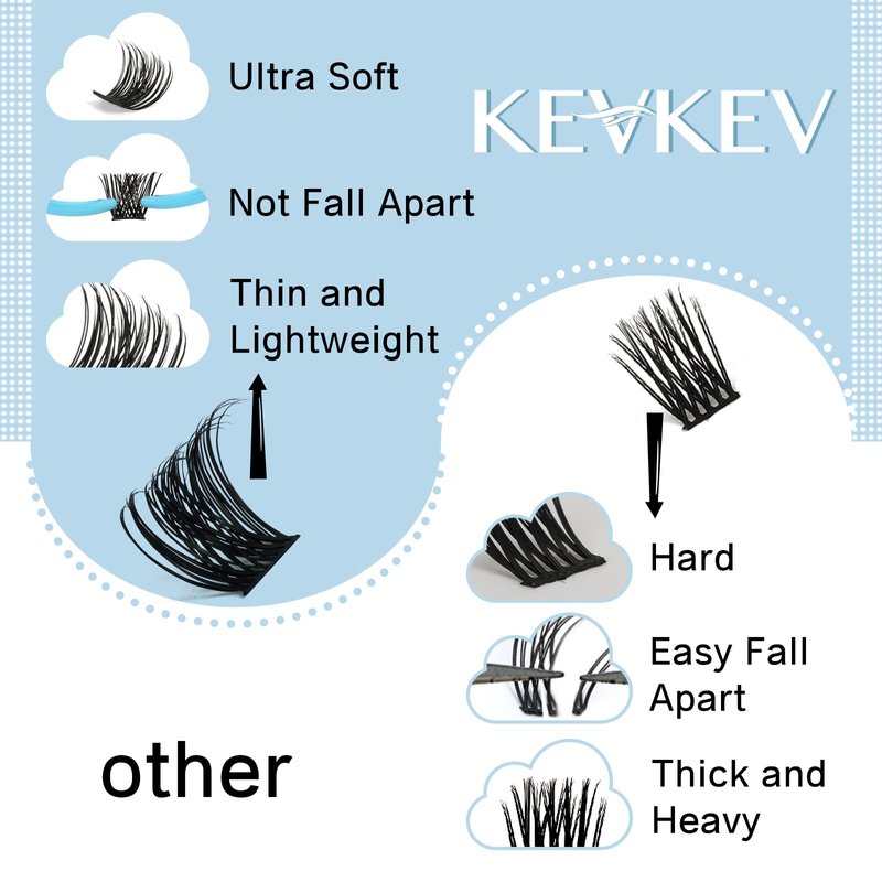 - Ultra Soft Lash Clusters: Experience the lightweight and thin design of KevKev ultra soft lash clusters. They are specifically crafted to be lighter and thinner than standard models, ensuring a comfortable and natural feel when worn.