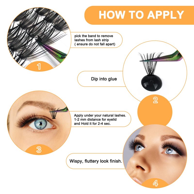- Suitable to wear: Use a tweezer to pinch the band of cluster eyelashes and apply lash clusters below your natural lashes. You can barely feel the cluster lashes. The bottom of the clusters is flat and hardly noticeable. The lash band part will not stab your eyelid area when you blink. Bring you a perfect experience during lash application.