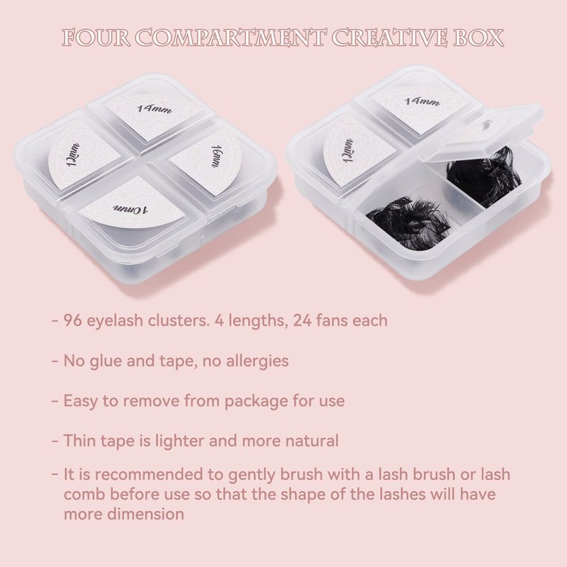 - 【DIY Lash Clusters At Home】:96 clusters in one tray. You can apply the cluster eyelash extensions at home by yourself. The eyelashes are easy to apply, the effect is gorgeous, and the clusters do not fall off easily. Cluster eyelashes take less time to complete each eye. Now save a lot of money and time.