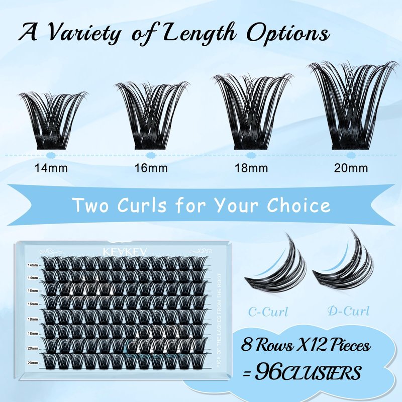 - Different lash styles & length to suit your mood: KevKev offers multiple lengths and curls for different lash look. 84 lash clusters, 8mm - 16mm in length. Try to find your own lash style at KevKev.