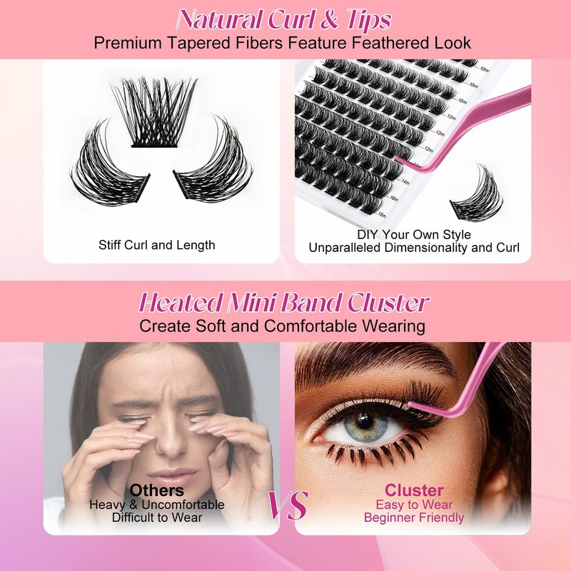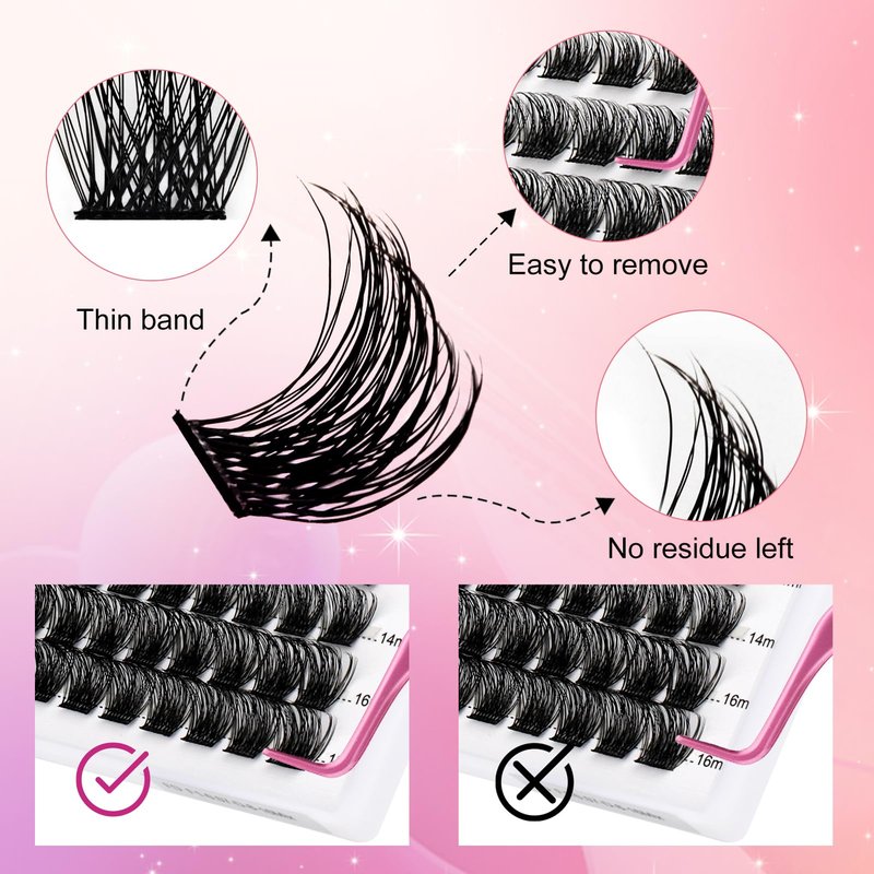 - Suitable to Wear: Use a tweezer to pinch the band of lash clusters and apply them below natural lashes. You can barely feel the lash cluster extensions. The bottom of the lash clusters is flat and hardly noticeable. The cluster lashes band part will not stab your eyelid area when you blink. Bring you a perfect experience during lash application.