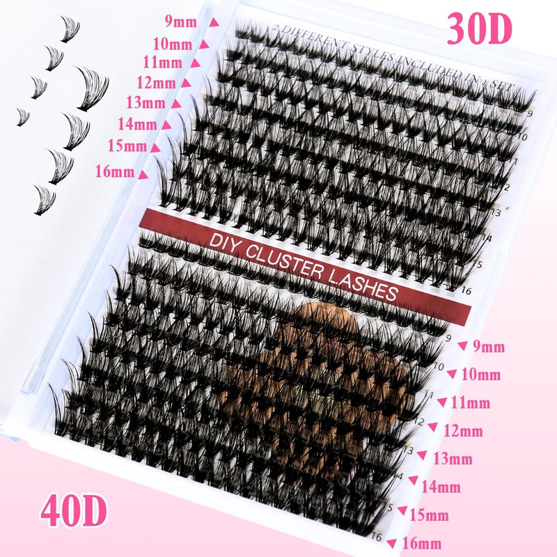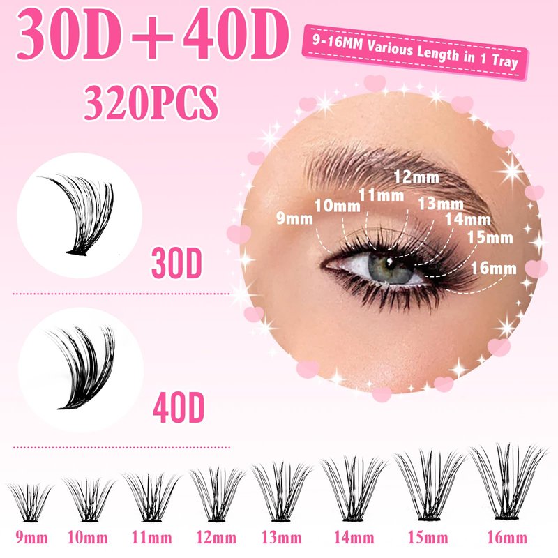 - 【320 PCs Large Volume Lash Clusters】 - Our lash extension kit includes a whopping 320 pieces of 0.1mm thickness clustered eyelashes in 30D+40D styles, lengths from 9mm to 16mm.
