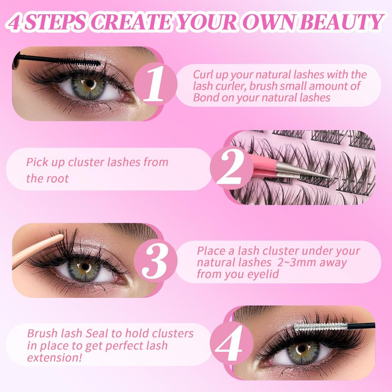 - 【HOW TO APPLY】How to Apply DIY Lashes: Gently dab the cluster lash glue on your natural eyelashes, and then apply the lash clusters in the way you like. If needed, brush a thin layer of sealer for reinforcement.