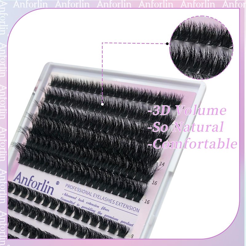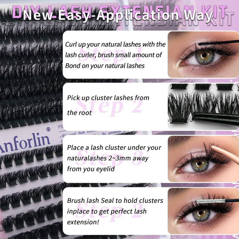 - HIGH QUALITY INDIVIDUAL LASHES KIT: Anforlin Lash clusters are made with the finest updated PBT materials and 0.05mm ultra-fine band. Upgraded technology ensures them will not break when removed with tweezers and can be worn repeatedly many times. Bond and seal eyelash glue features a double-ended design with a spiral mini mascara brush head on the bond side for even and easy application, and a seal side that forms a protective layer and improves adhesion for longer retention.