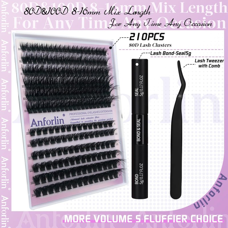 Lash Extension Kit Anforlin Fluffy Eyelash Extension Kit with 210PCS 80D+100D 8-16mm Lash Clusters, Lash Bond&Seal and Lashes Tweezers DIY Individual Eyelashes Kit for Beginner DIY at Home