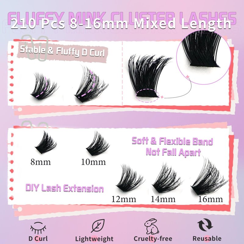 ●210pcs D curl cluster lashes 80D+100D with different lengths(8-16mm), which can meet your needs in different occasions.