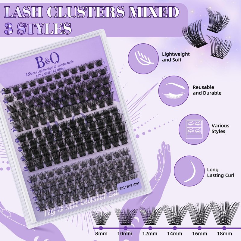 Clusters lashes and Applicators: B&Q Lash chooses the most popular products for lash clusters and makes them in a set. And there are tutorials on the listing and the packaging box, which is very suitable for novices who don’t have eyelash extensions. With dozens of lash styles to choose from, there's always a style that's right for you.