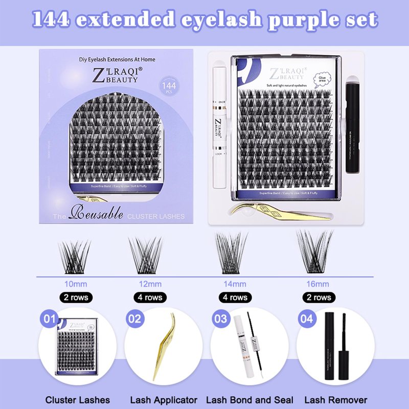 - 【DIY Lash Extension Kit】Lash extension kit includes: 144pcs D curl lash clusters, 2*12pcs 10mm, 4*12pcs 12mm, 4*12pcs 14mm, 2*12pcs 16mm,lash bond and seal, lash remover and lash tweezers.Try to DIY your own lashes now! Save much time and budget to go to lash extension salon.