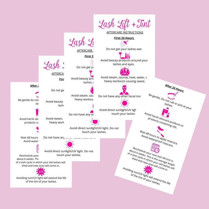 - Design is white with pink icons lash lift + tint aftercare instructions.