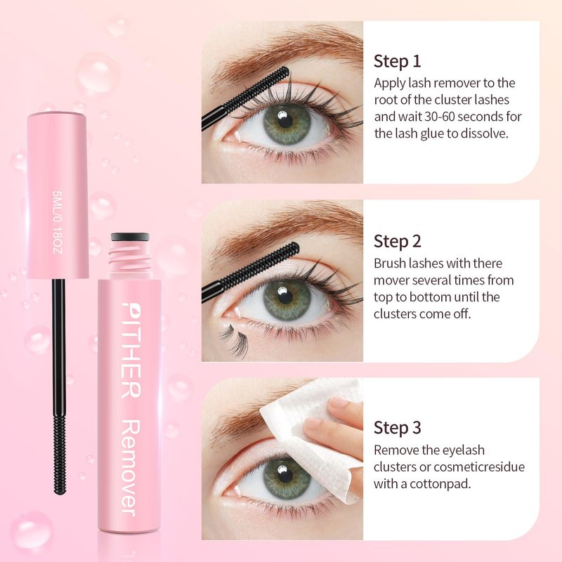 - ✨Usage Steps: 𝐀𝐩𝐩𝐥𝐲 𝐞𝐲𝐞𝐥𝐚𝐬𝐡 𝐫𝐞𝐦𝐨𝐯𝐞𝐫 𝐭𝐨 𝐭𝐡𝐞 𝐫𝐨𝐨𝐭 𝐨𝐟 𝐭𝐡𝐞 𝐜𝐥𝐮𝐬𝐭𝐞𝐫 𝐥𝐚𝐬𝐡𝐞𝐬 𝐚𝐧𝐝 𝐰𝐚𝐢𝐭 𝟑𝟎-𝟔𝟎 𝐬𝐞𝐜𝐨𝐧𝐝𝐬 𝐟𝐨𝐫 𝐭𝐡𝐞 𝐥𝐚𝐬𝐡 𝐠𝐥𝐮𝐞 𝐭𝐨 𝐝𝐢𝐬𝐬𝐨𝐥𝐯𝐞. Brush the eyelash brush from top to bottom several times until the eyelash clusters fall off. Use a cotton pad to gently wipe away lash clumps or makeup residue.