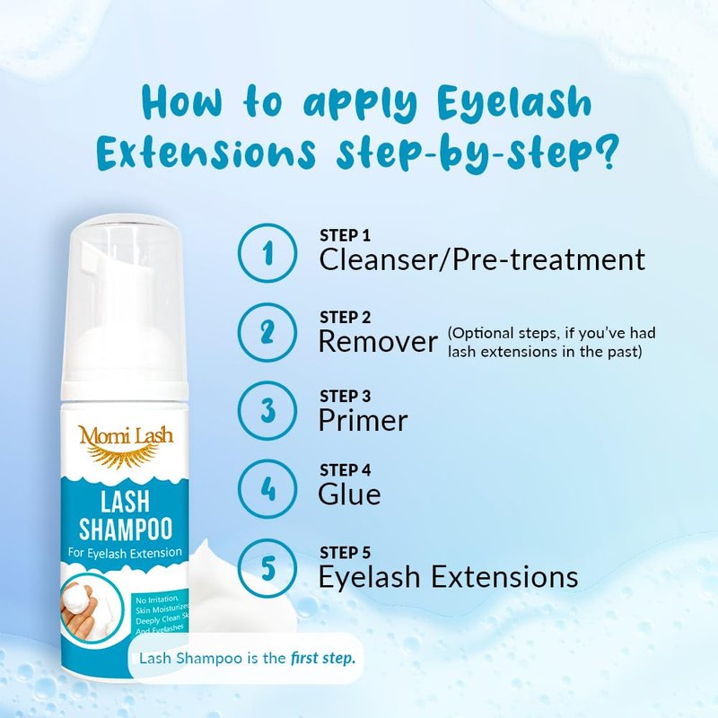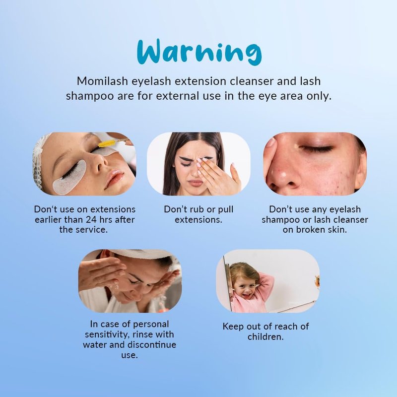 - 🌸Warm Note: ◎ Momilash eyelash extension cleanser and lash shampoo are for external use in the eye area only. ◎Don‘t use on extensions earlier than 24 hrs after the service. ◎Don’t rub or pull extensions. ◎Don’t use any eyelash shampoo or lash cleanser on broken skin, ◎In case of personal sensitivity rinse with water and discontinue use. ◎Keep out of reach of children.