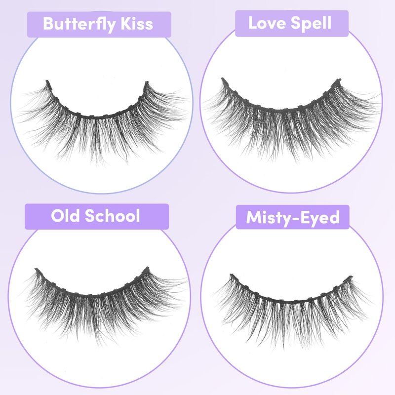 - Try all 4 styles: Experiment with different looks using Love Spell, Misty-Eyed, Old School, and Butterfly Kiss lash styles