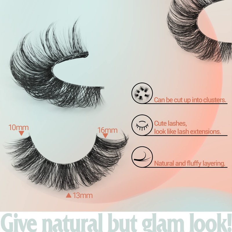 - โ Give natural but glam look! โ16MM soft clear band eyelashes, can be cut up into cluster eyelashes, closing fitting eyelid, skin friendly. Fishtail shaped short mink eye lash, enlarges our eye easily. Curly but not the russian strip lashes, do not poke eyelids.