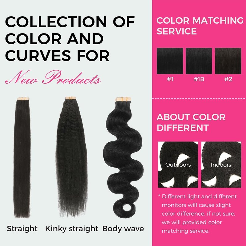 - [Excellent Color Match & Versatility in Style] Our Tape in Human Hair Extensions are designed to match your hair color perfectly, with a healthy and natural shine. Straight, Kinky Straight and Body Wave are available, You can do as you like be dyed, strengthened, curled. It's better to do this by professionals, please keep the temperature below 350 Fahrenheit.