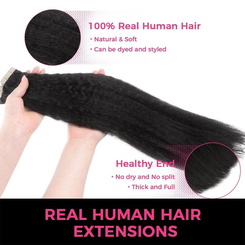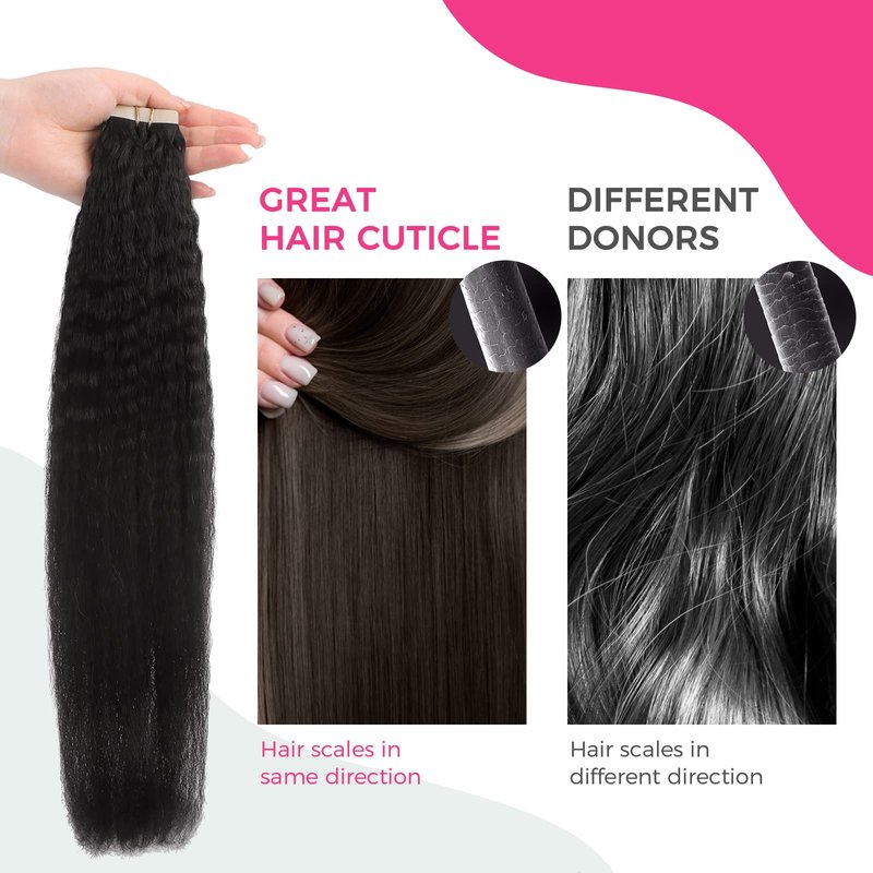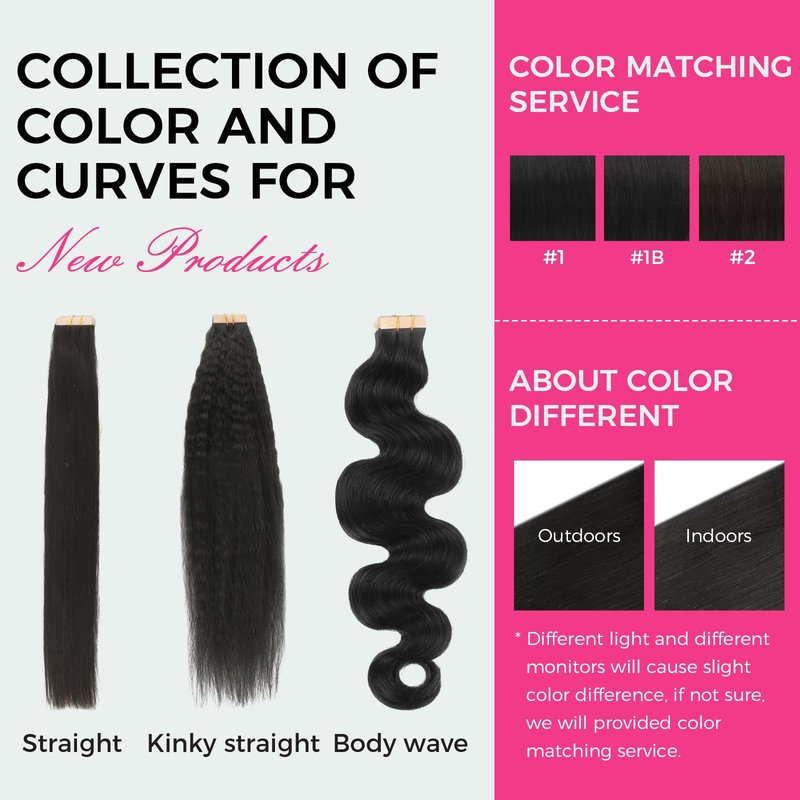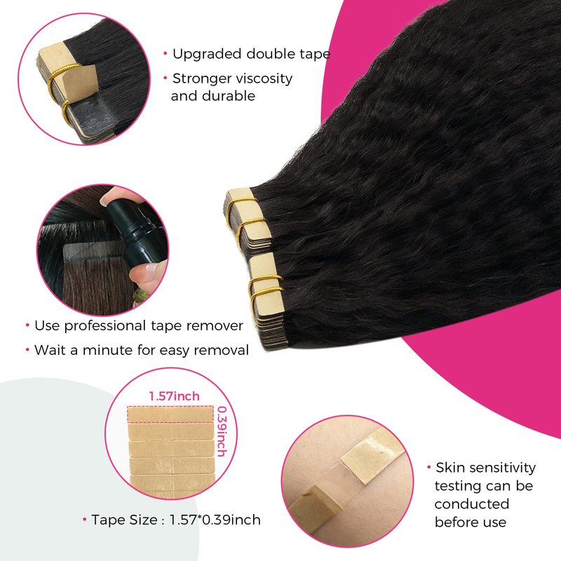 - [Excellent Color Match & Versatility in Style] Our Tape in Human Hair Extensions are designed to match your hair color perfectly, with a healthy and natural shine. Straight, Kinky Straight and Body Wave are available, You can do as you like be dyed, strengthened, curled. It's better to do this by professionals, please keep the temperature below 350 Fahrenheit.