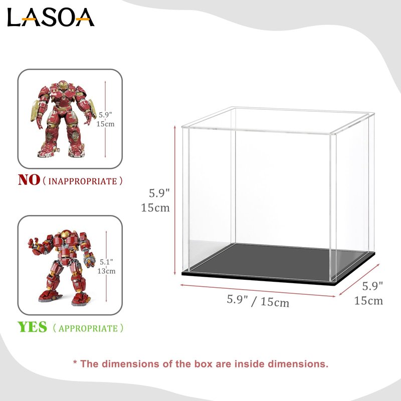 LASOA Acrylic Display Case for Collectibles, Alternative Glass Display Box with Black Base and Lid, Self-Assembly Clear Storage Showcase for Figurine Memorabilia (6x6x6inch;15x15x15cm)