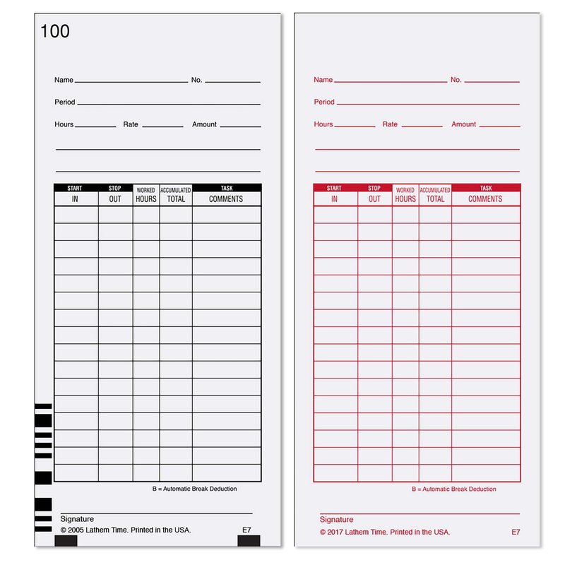 - Pack of 100 bar coded time cards; Signature line