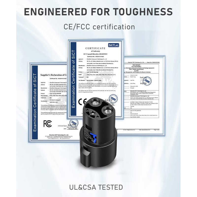 - 【Rigorously tested and certified for safety】– The J1772 adapter has undergone extensive testing by a recognized laboratory facility, confirming its flame-retardant, pressure-resistant, and abrasion-resistant properties. With CE/FCC/IPX5 certification and UL&CSA test report, Tesla owners can trust the adapter for safe and reliable charging