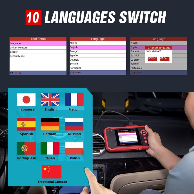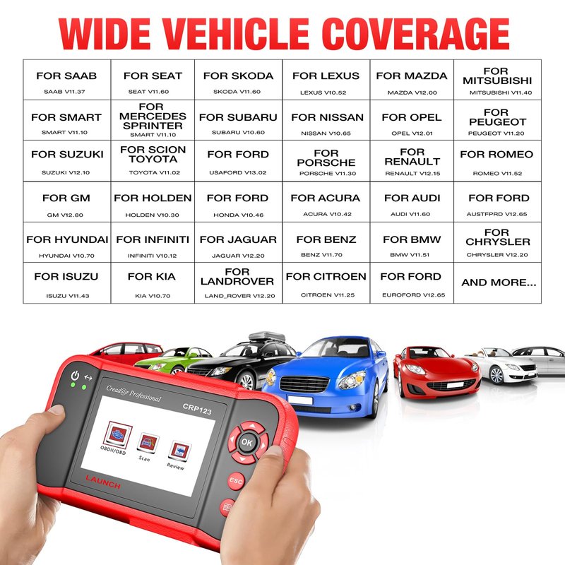 - [Extensive Vehicle Coverage + 10 Languages]--The LAUNCH CRP123 reads data from ENGINE, TRANSMISSION, ABS and SRS systems from Asian, US and European manufacturers. Coverage includes for Suzuki, for Honda, for Mitsubishi, for Nissan, for Toyota,for Mazda, for Hyundai,for Kia, for Subaru,for Infiniti, for Lexus, for Acura, for Isuzu, for Ford, for GM, for Chrysler, for Benz, for BMW, for VW, for Opel, for Volvo, for Fiat,for Land Rover, for Seat, for Skoda, for Audi,for Porsche, for Saab, for Jaguar and many others. Support 10 different languages.