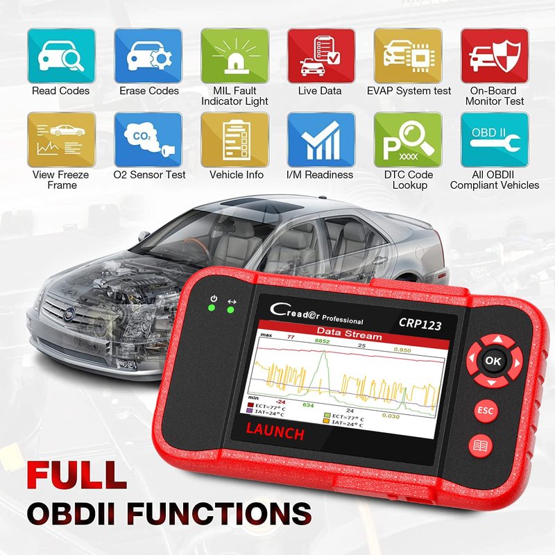 - [Full OBDII Test Code Reader]----LAUNCH CRP123 scan tool supports all 10 modes of OBDII standard to ensure complete, accurate, system diagnosis. Read and Clear DTCs, do smog tests , I/M readiness and O2 sensor tests, Mode 06 EVAP system test, Mode 08 on-board test component test. And OBDII Code lookup tool and acronym database to assist and speed diagnosis and repair time.
