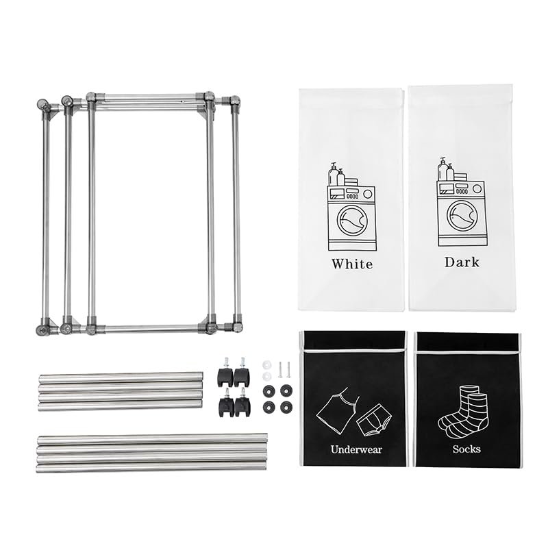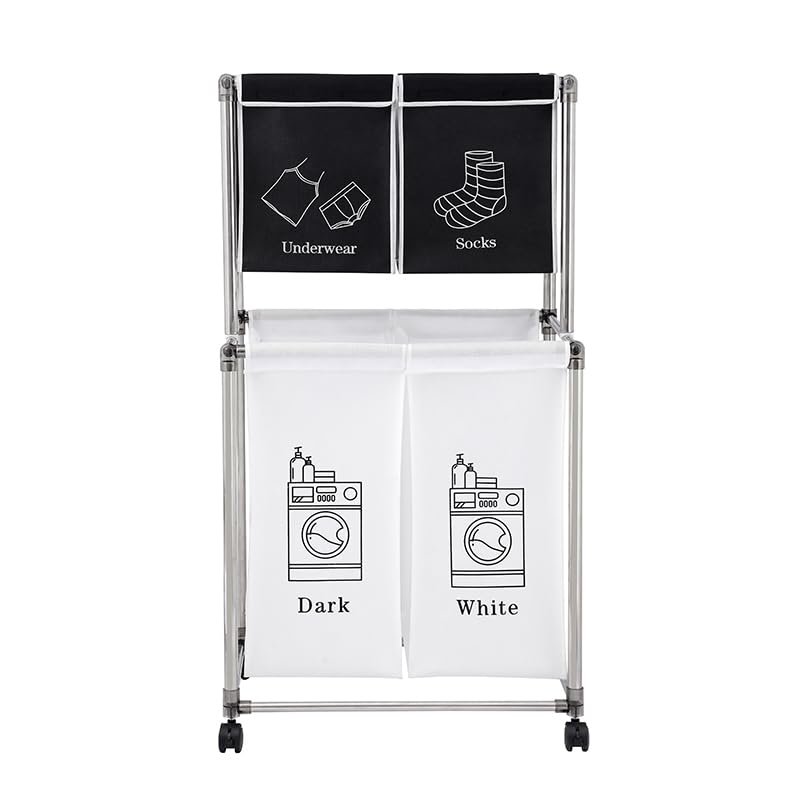 CLOTHES LANUDRY SORTING - STQCPJ Dirty clothes laundry sorter hamper with 4 removable canvas labeled bags. You can distinguish your socks, underwear, which I think should be separated. It also sorts dark and light colored clothes to prevent them from being stained.WEAR RESISTANT AND WATERPROOF - STQCPJ home laundry sorting basket is lined with 6DD premium oxford fabric, which is wear-resistant and easy to clean. Strong Velcro locks the edges of the bag securely, so even when it's full, you don't need to worry about the bag falling out.STRONG FRAME - STQCPJ laundry sorter uses a double-layer design, which is stronger than a single-layer structure because it reduces the pressure and burden of the crossbar. The overall frame is made of hard aluminum to enhance hardness, and the non-slip design at the bottom provides the final protect of stability.LARGE CAPACITY STORAGE - STQCPJ Laundry Sorter Storage is 38 ''(H), 22 ''(L) and 16 ''(W). Large capacity 2-tier laundry separator hamper holds even a family's laundry.EASY INSTALLATION - STQCPJ laundry sorter is designed for easy use as household and can be a necessity in the home. Detailed drawings enable you to complete it easily.