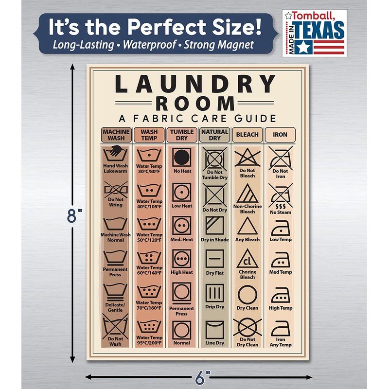 - Upgrade Your Laundry Space –– Offer a handy guide in your laundry room, dorm, or laundromat with these laundry magnets for washing machine essentials covering drying, ironing, dry cleaning, and bleaching. This piece of laundry room decor enlightens users swiftly on what each icon signifies.