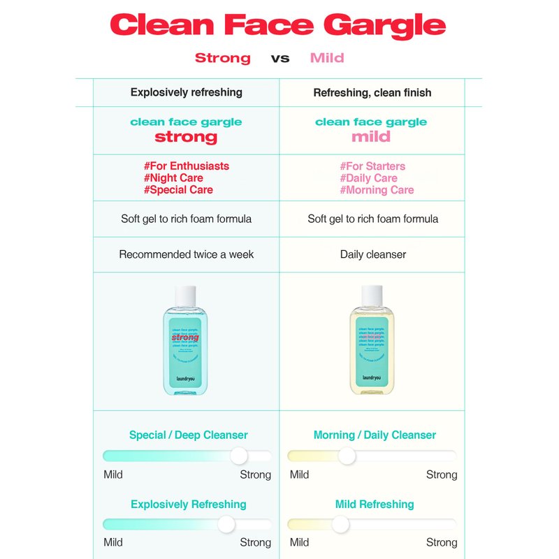 - MILD AND HYPOALLERGENIC FORMULA: Our Clean Face Gargle Gel-To-Foam Cleanser Mild is a gentle fusion of skincare and laundry innovation. Suitable for all skin types, it boasts hypoallergenic ingredients that nurture your skin. Regular use shields your skin from harmful substances, controls sebum, and promotes healing, making it a gentle yet effective choice for daily cleansing.