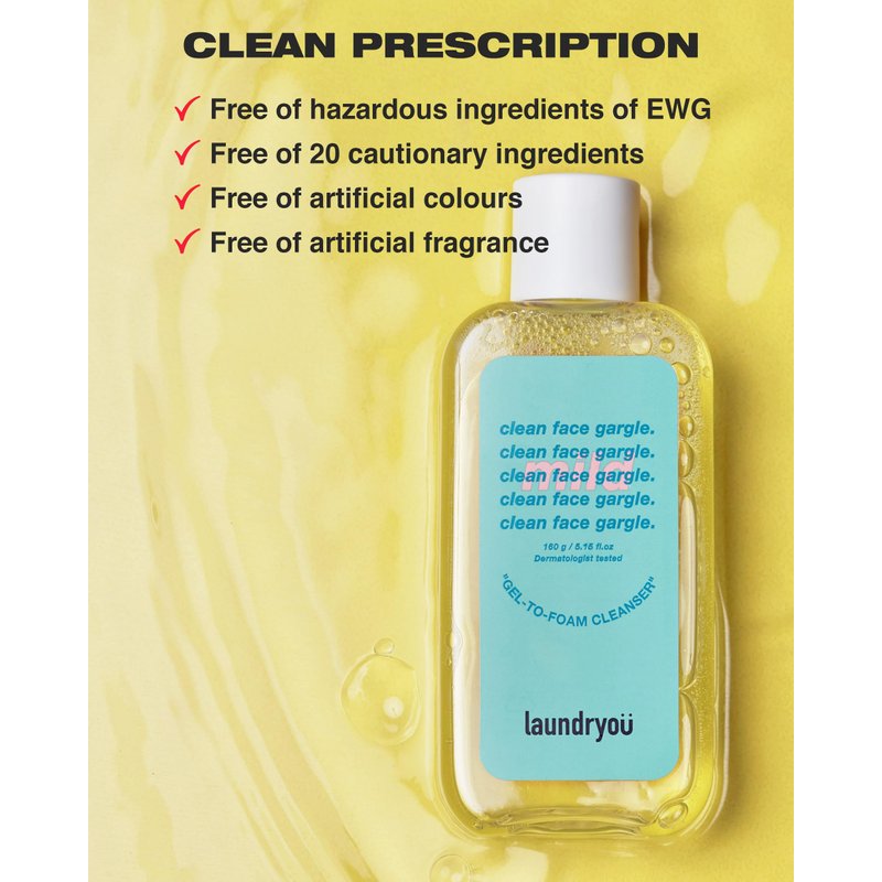 - PRODUCT ETHOS AND BRAND: The Clean Face Gargle Gel-To-Foam Cleanser Mild epitomizes our commitment to blending skincare with laundry care. As pioneers in eco-friendly skincare, we minimize carbon footprints and bring a touch of delicate laundry care to your routine. Our brand is dedicated to providing clean comfort for your skin, balancing skincare needs with environmental responsibility.