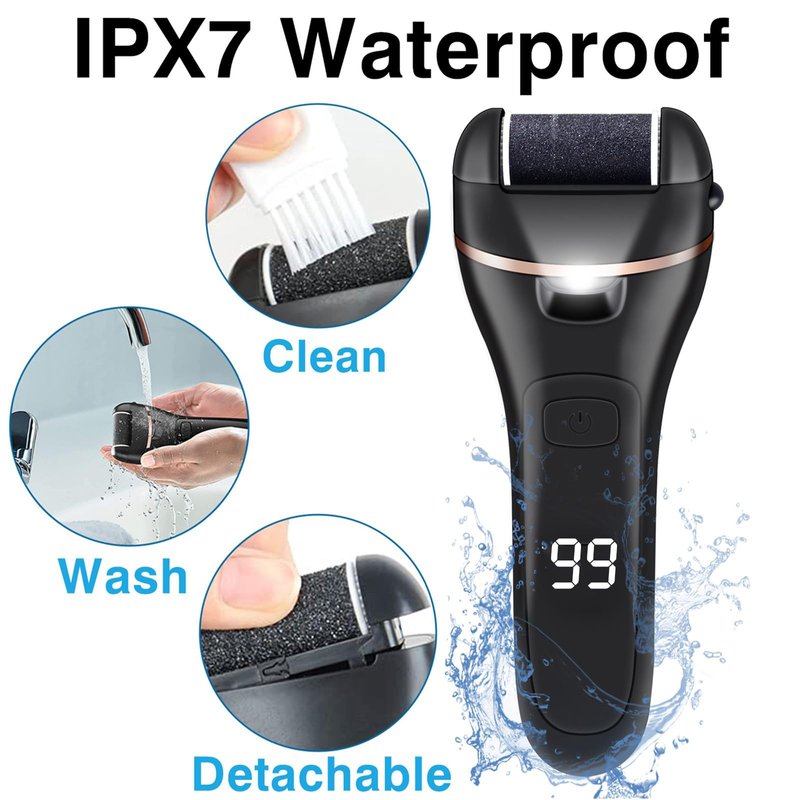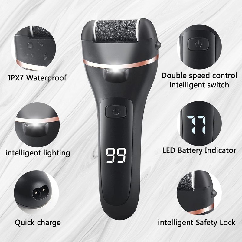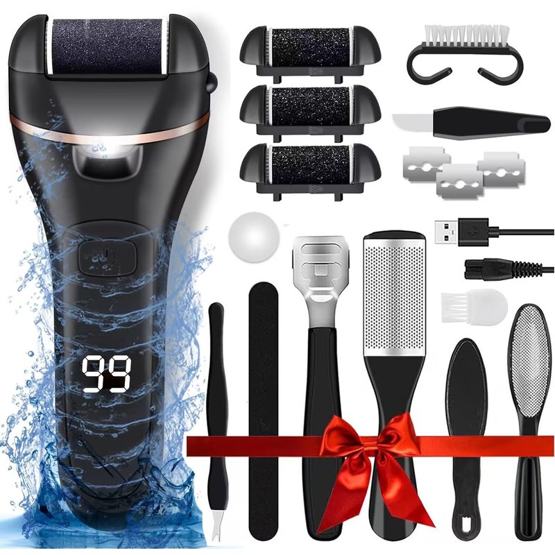 Electric Foot Callus Remover Pedicure Kit Tools Set with Rechargeable & LED Battery Capacity Display & IPX7 Waterproof & LED Lighting helps to Remove dead skin and calluses, let your feet more clean, healthier, smoother and breathe freely. Perfect for Christmas, New Year, birthday gift. 3 Detachable Roller Heads Rough roller head for remover stubborn horny dead skin, medium roller head for remover rough dead skin and fine roller for daily foot care. LED Indicator The LED indicator is convenient for us to use day or night. It is an indicator of remaining battery power, which is convenient to remind you to charge in time. 2 Speeds Adjustable 1700x/min low speed and 2000x/min high speed. With 2 speeds adjustable design, the foot grinder callus remover can be easily control the fast or slow. 19 in 1 Pedicure Tools Set * 3x Different Roller Heads * 1x Callus Remover * 1x Roller Head Brush * 1x Foot File * 1x Elliptical Callus Remover * 1x Double-Sided Sandpaper File * 1x Callus Scraper * 3x Pedicure Blade * 1x Nail File * 1x V-Shaped Cuticle Trimmer * 1x Callus Shaver * 1x Nail Brush * 1x Silicone Pad * 1x USB Cable * 1x Accessories Box * 1x User Manual