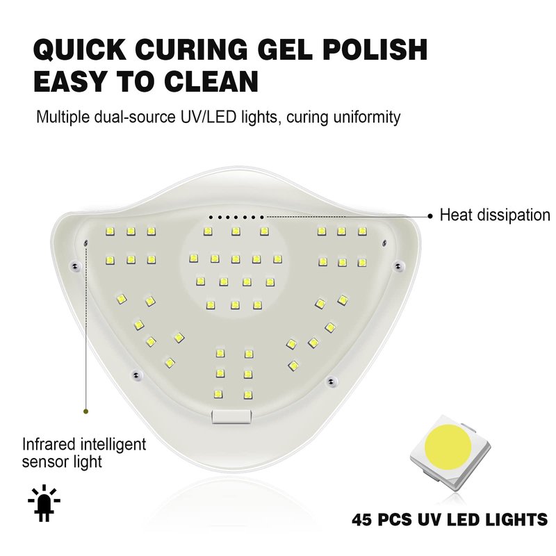 Our led gel nail dryer with 45 pcs led light source evenly distributed inside and make drying gel nails more faster.