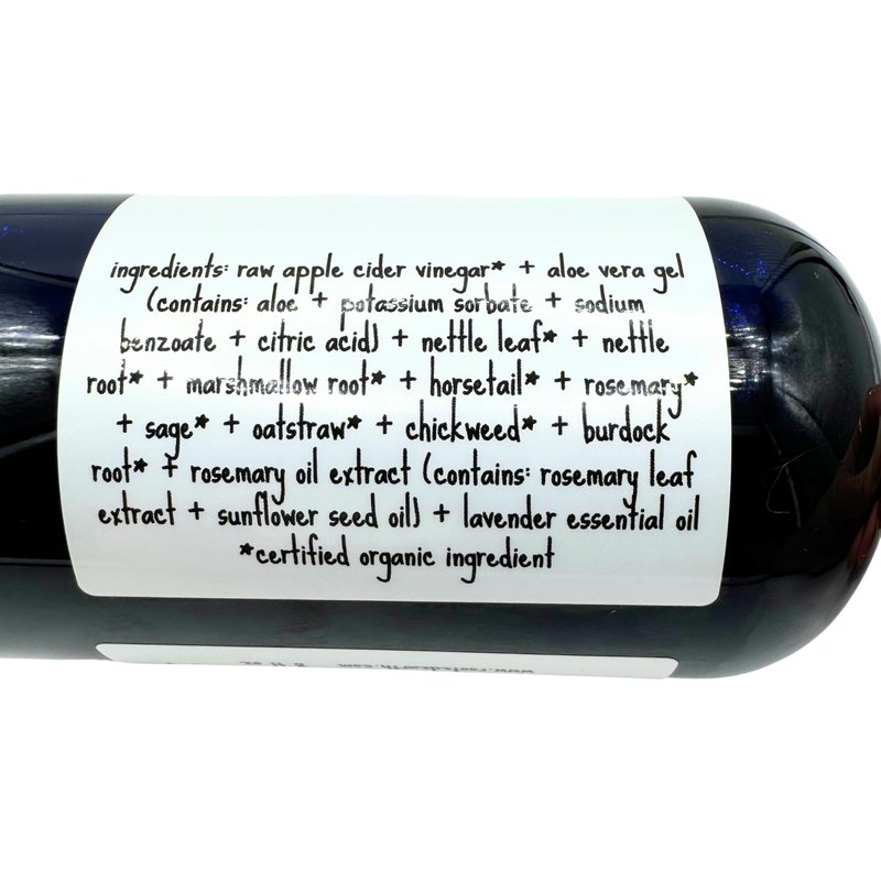Made with raw organic apple cider vinegar + aloe vera + nettle leaf and root + marshmallow root + horsetail + rosemary + sage + oatstraw + chickweed + burdock root + rosemary oil extract + pure therapeutic grade essential oils.