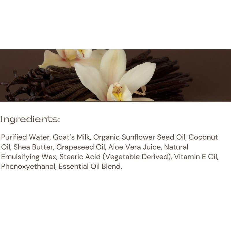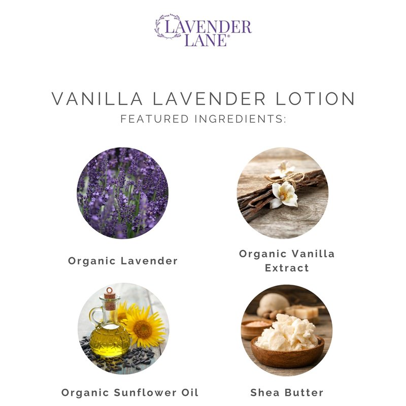 Elevate your skincare routine with our lavender farm's Nourishing Vanilla Lavender Lotion, a decadent blend crafted from the finest ingredients nature has to offer. Enriched with the creamy goodness of goat's milk, the nourishing properties of sunflower oil, the luxurious feel of shea butter, and the tropical hydration of coconut oil, this lotion is a sensory delight. Immerse yourself in the calming essence of lavender as your skin absorbs the rich, moisturizing goodness, leaving you with a velvety softness that lasts. Embrace the luxury of nature's touch with our Vanilla Lavender Lotion – a symphony of botanical bliss for your skin.