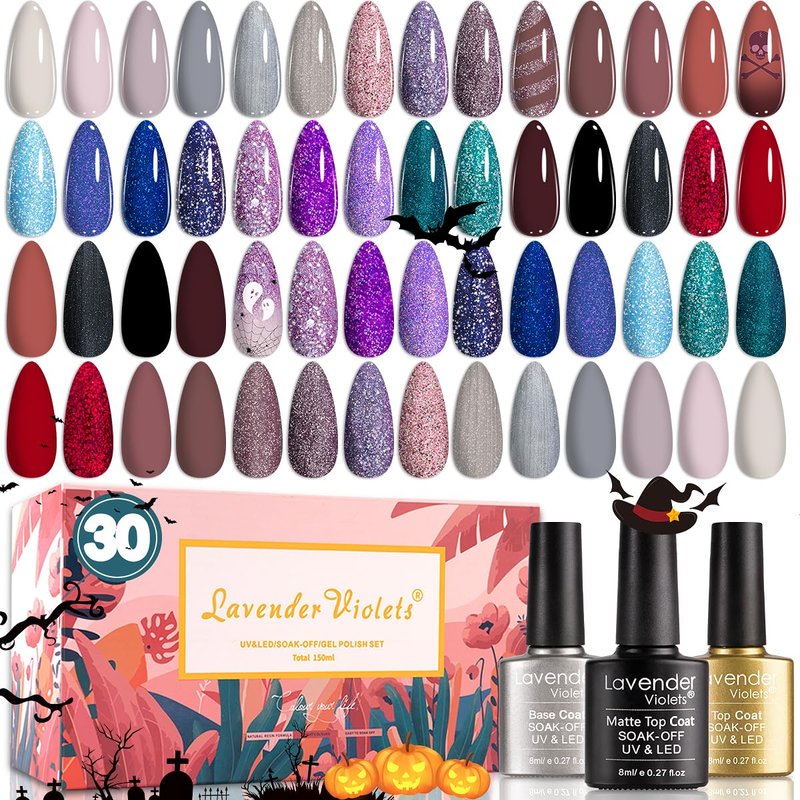 Unleash your creativity with the Lavender Violets gel nail polish kit, featuring 27 vibrant gel nail polish colors along with a matte gel top coat, gel top coat, and base coat. This gel nail polish kit offers everything you need to express yourself through stunning nail art. From neutral tones to vibrant hues like red, light red, blue, dark blue, bright purple, dark green, bright green, brown, and black, you'll find the perfect shade for any occasion. Enjoy a salon-quality gel manicure experience at home with our gel polish set, infused with natural resin to prevent chipping, breakage, and yellowing while promoting healthy nails. This nail polish kit is perfect for both professionals and beginners, providing a flawless finish with ease. It also makes an ideal gift for nail enthusiasts, suitable for daily wear, parties, holidays, and special occasions like Valentine’s Day, anniversaries, Thanksgiving, Halloween, Christmas, and Mother’s Day. Indulge in a luxurious at-home nail salon experience and explore endless possibilities with this comprehensive gel nail polish set