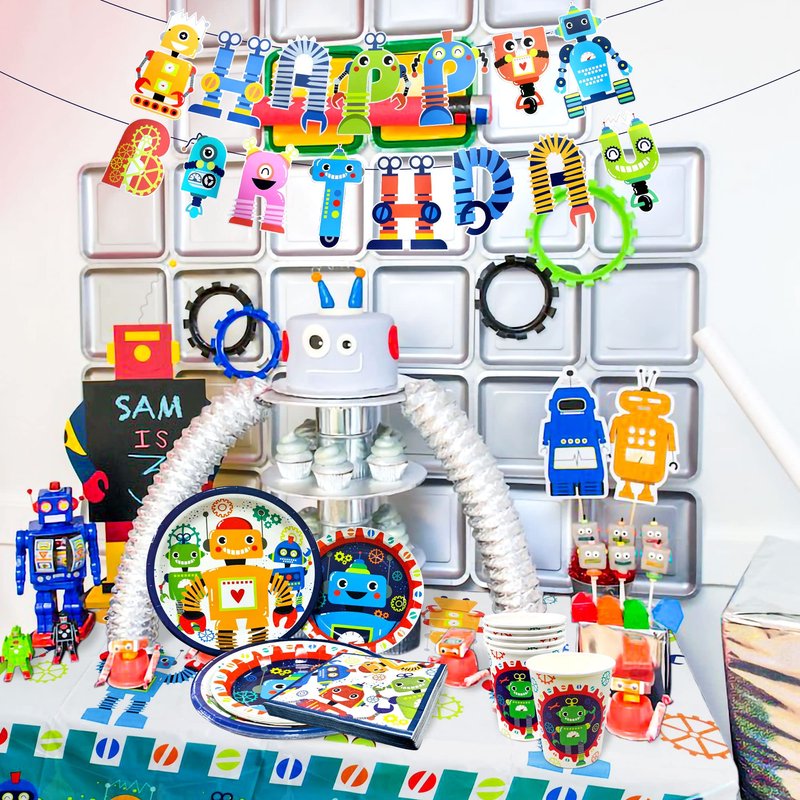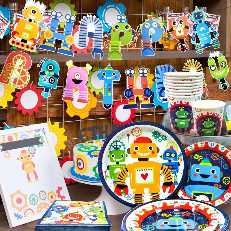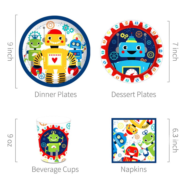 - What you will receive:1 x Robot Birthday Banner, 8 x 9 inch robot plates, 8 x 7 inch robot plates, 8 x robot cups, 20 x robot napkins, 1 x robot tablecloth