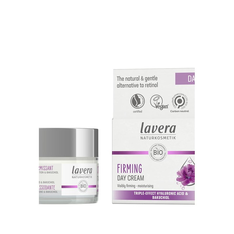 Our firming day cream with triple-effect hyaluronic counteracts the ageing process of the skin the natural way, the highly effective and well-tolerated formula is to stimulate the skin's own collagen system and reduces wrinkles. Feel the evanescent texture envelop your skin, providing intense moisture and nourishment for a firmer, fresh and even complexion, instantly melts into the skin providing intense moisture and leaving it looking radiantly beautiful and feeling exceptionally well-pampered. Enriched with Hyaluronic Acid that rests on your skin like an invisible protective shield and supplies it with valuable moisture, leaving skin smooth and thus preventing it from drying out, increasing the water content of the skin, thereby effectively reducing wrinkles. Contains Bakuchiol a gentle and natural alternative to retinol and contributes to the structure of the skin's collagen matrix, the natural moisturizer stimulates the skin's own collagen synthesis, reduces the depth of wrinkles and evens the complexion, As a powerful antioxidant, protects free radicals from skin cells and fades pigment spots. Biologically degradable formula, free from mineral oils. PETA is certified and committed to animal welfare. Jar is recyclable & the cardboard material in the folding box is made from 100% recycled fibres. The Firming facial skincare counteracts the skin ageing process the natural way, and experience a firm, fresh and even complexion. Lavera Naturkosmetik has developed nourishing recipes for the Face Care collection that provides your skin with intensive moisture using exclusive active ingredients to protect your skin from drying out. We manufacture our own products organic plant and organic extracts and combine them with innovative active ingredients. Every skin type has its own special care needs. If you value natural ingredients and products that are mild on your skin, Lavera Naturkosmetik is the right choice for you.