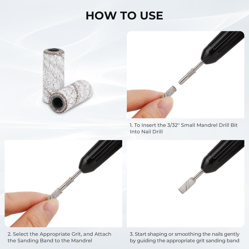 - EASY, FRIENDLY TO BEGINNER: Perfectly fitting most 3/32" nail drill machines. Just select a Nail Sanding Band and apply gentle pressure onto the nail bed. Suitable for both manicures and pedicures, ideal for natural or artificial nails, ensuring a friendly easy-to-use nail care experience!