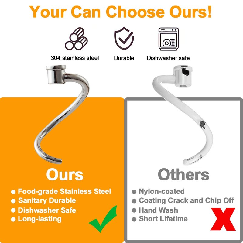 - Sturdy and Durable: Crafted from food grade stainless steel, this mixer dough hook is rust-proof and much stronger than aluminum alternatives. You can trust its long-lasting durability, eliminating worries about break or peeling coatings, ensuring healthier mixing.
