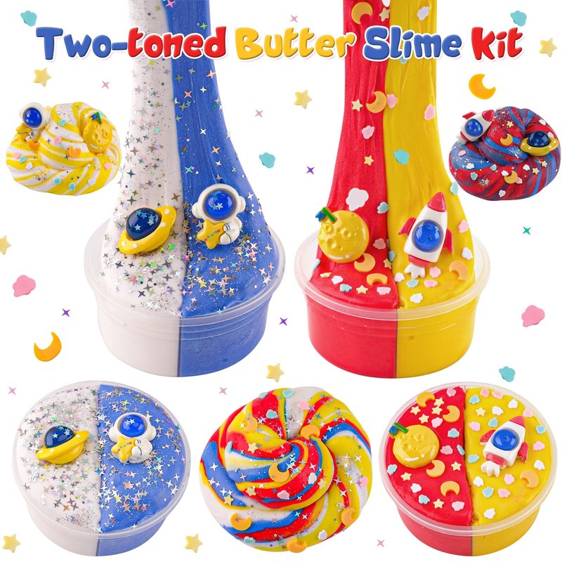 - 【Two-Toned Butter Slime Kit】Our galaxy slime kit includes 4 different colours of slime: yellow and red butter slime, white and blue butter slime. Each container holds 120ml of slime. The slime set with space slime charms contains 240 ml in total. You can experience the amazing effects of mixing and matching non-stick butter slime.