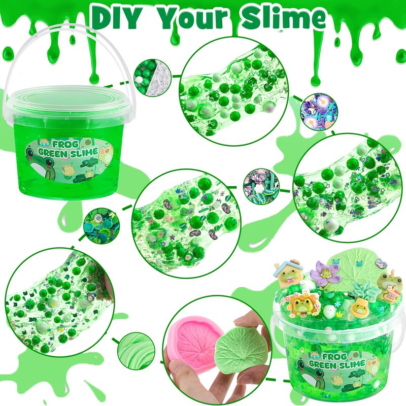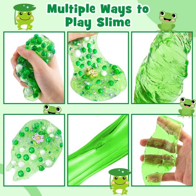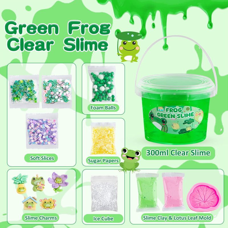 - 🐸【Frog Slime Kit】Our kids clear slime kit includes 300ml green clear slime and 7 packs slime add-ins and 5 cute frog slime charms. Create your own unique slime creations with this clear slime set featuring a frog with a variety of adorable slime charms and rich soft pieces.
