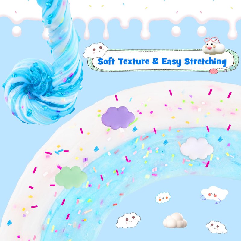 - ⛅【Slime Party Favors for Kids】This blue sky slime kit comes with adorable slime charms and makes a great party favour for both boys and girls, as well as a great gift choice for a variety of festivals, birthdays, Christmas and Easter.