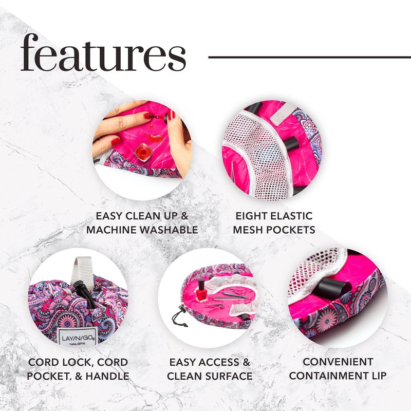 The Lay-n-Go Nail Spa is breaking all the rules to provide a bag that just makes sense. This patented nail storage bag offers a stylish solution designed to upgrade, uncomplicate and beautify all aspects of nail care. The Lay-n-Go NailSpa is a patented portable nail station that carries your favorite polishes and tools while providing a clean flat surface to paint. Eliminate the need for paper towels and magazines while promoting professional elegance by painting directly on the surface of the NailSpa. The convenient design is machine washable and features water resistant polyester skin that is easy to wipe while the raised lip keeps polish and tools from escaping. A favorite for nail care professionals on the road. Designed in the USA, our unique products undergo rigorous quality-control trials to provide you with a durable, high quality organization solution. Lay-n-Go is a women owned quintessential innovative brand obsessed with developing organizational solutions for the entire family. A name you can trust and the only one awarded with 3 Patents for its one-of-a-kind inventions: U.S. Patent No. 9,084,459, U.S. Patent No. 10,016,036, and U.S. Patent No. 10,561,213.