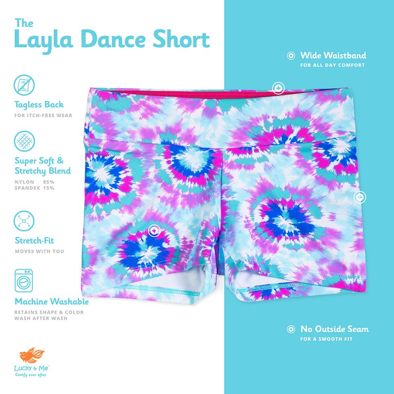 Whether your little one leaps across a stage or tumbles at the gym, Layla Dance Shorts will keep up. These super soft and stretchy active shorts are designed to flex with her best moves. The wide waistband stays smooth and flat so your little one can stay comfortable and confident for any activity. And she'll love the vibrant colors and foil prints. Pair them with our Layla Racerback Crop top for a perfectly coordinated look.All Lucky & Me products are certified to OEKO-TEX Standard 100, which means they are tested and confirmed free of harmful substances, finishes, and chemicals. So when you buy our products you can be sure they are safe for your children. Our products are ethically made. We choose our partners carefully and all factories are WRAP, Sedex, or SA8000 certified.