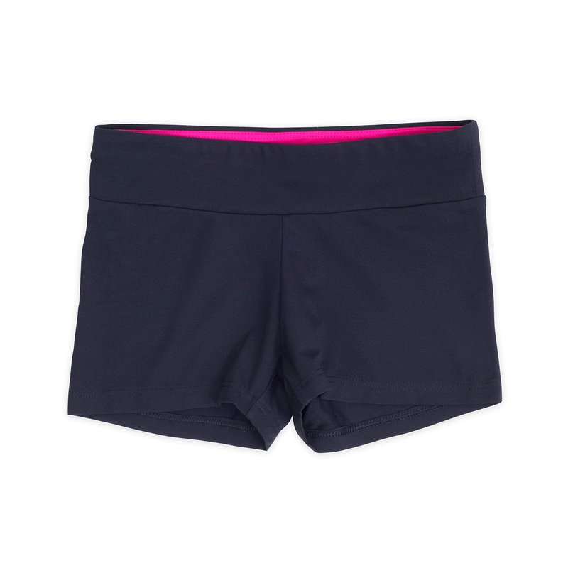 - Tagless gymnastics shorts with comfy wide waistband that stays smooth and flat for all-day comfort.