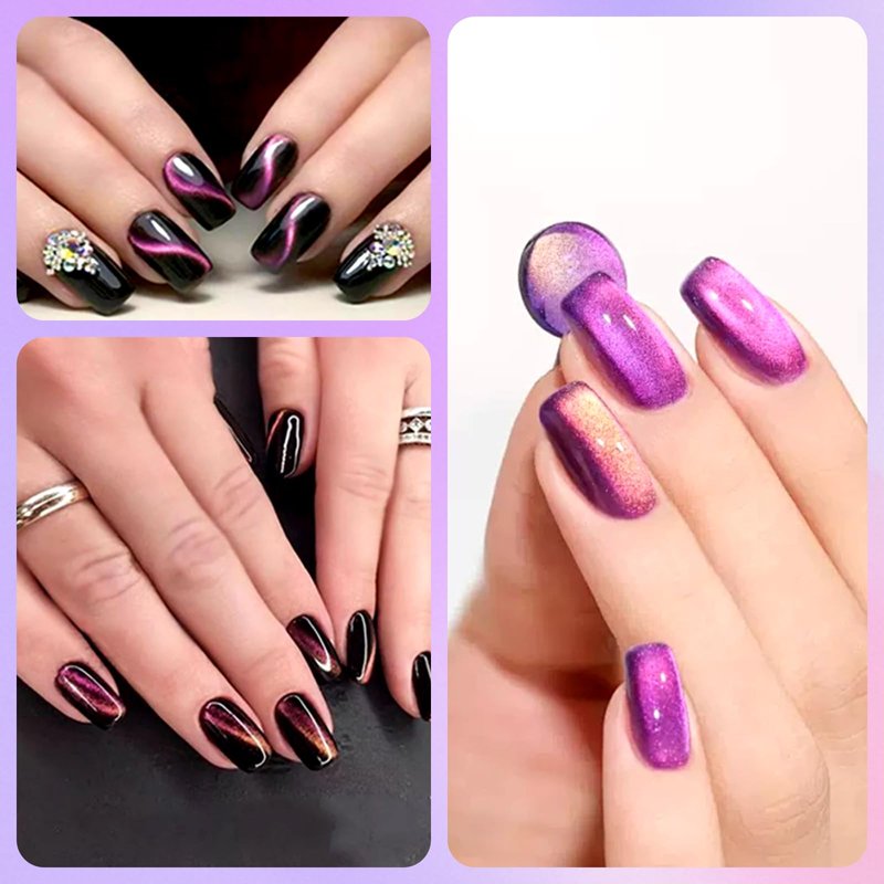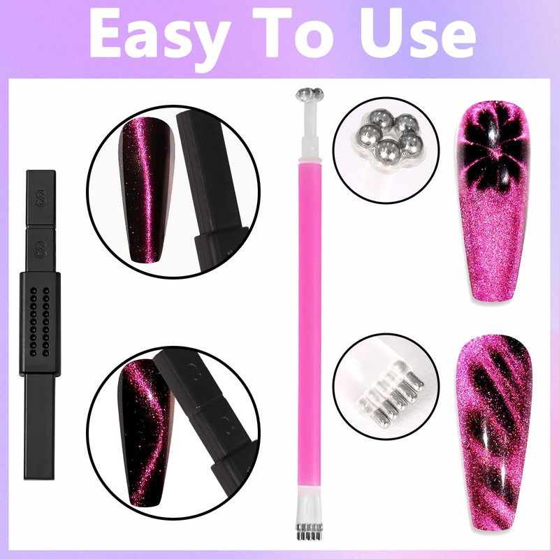 - Easy To Use: First, apply cat eye gel nail polish on nails. Second, keep the magnetic nail wand closely stay over to nail surface for 10-15 seconds to achieve the cat eye effect you want (remember not to touch the nail surface). Third, immediately cure it with UV or LED light for 60 seconds.
